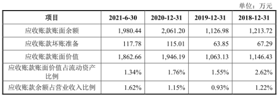 2018年至2021年1-6月,宏石激光應收賬款賬面余額分別為1,213.72萬元、1,126.98萬元、2,061.20萬元、1,980.44萬元,應收賬款賬面價值分別為1,146.43萬元、1,063.13萬元、1,946.19萬元和1,862.66萬元,占流動資產(chǎn)比例分別為2.62%、1.55%、1.76%和1.34%。