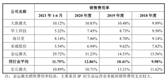 2018年至2021年1-6月,宏石激光銷售費用分別為11,591.83萬元、16,046.14萬元、19,132.02萬元和13,279.76萬元,占營業(yè)收入的比例分別為11.62%、13.21%、10.71%和10.89%。報告期內,同行業(yè)可比公司銷售費用率均值分別為9.98%、10.41%、12.86%、11.75%。