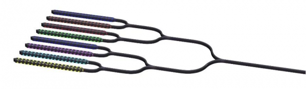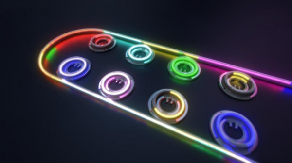 8個微環(huán)調(diào)制器和光波導。每個微環(huán)調(diào)制器都被調(diào)節(jié)到特定的波長(或者說“光色”)。利用多波長,每個微環(huán)都可單獨調(diào)制光波,以實現(xiàn)獨立通信。這種使用多個波長的方法就叫做波分復用。