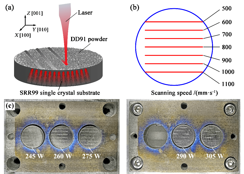 圍繞粉末床激光增材制備單晶組織的可行性,結(jié)合貴陽(yáng)航發(fā)精密鑄造有限公司的應(yīng)用需求,華中科技大學(xué)魏青松教授課題組利用激光選區(qū)熔化技術(shù)成形了DD91鎳基單晶高溫合金的單條熔道,研究了激光功率和掃描速度對(duì)單道形貌、晶體取向和微觀組織的影響規(guī)律,并進(jìn)一步探討了裂紋、雜晶等缺陷的產(chǎn)生機(jī)理,為SLM制備大尺寸單晶組織奠定了基礎(chǔ)。