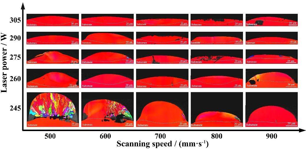 研究發(fā)現(xiàn),在290~305 W和500~700 mm/s的工藝窗口內(nèi),熔化道連續(xù)平穩(wěn)且光滑平直,熔池扁平規(guī)則,可為單晶組織的穩(wěn)定生長(zhǎng)提供保障。