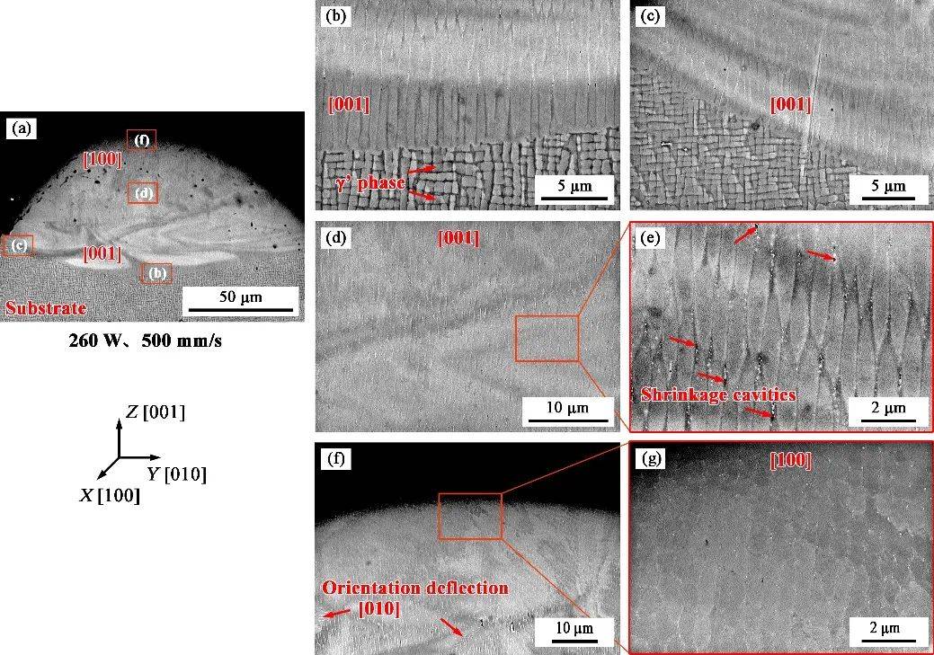 當(dāng)熔池與單晶基板冶金良好時(shí),熔池內(nèi)晶體能夠延續(xù)基板的取向沿[001]定向外延生長(zhǎng),如圖2所示。即:在粉末面心立方晶體結(jié)構(gòu)、元素成分屬性、熔池的高溫度梯度和單向傳熱方向的綜合作用下,單晶實(shí)現(xiàn)了穩(wěn)定生長(zhǎng)。