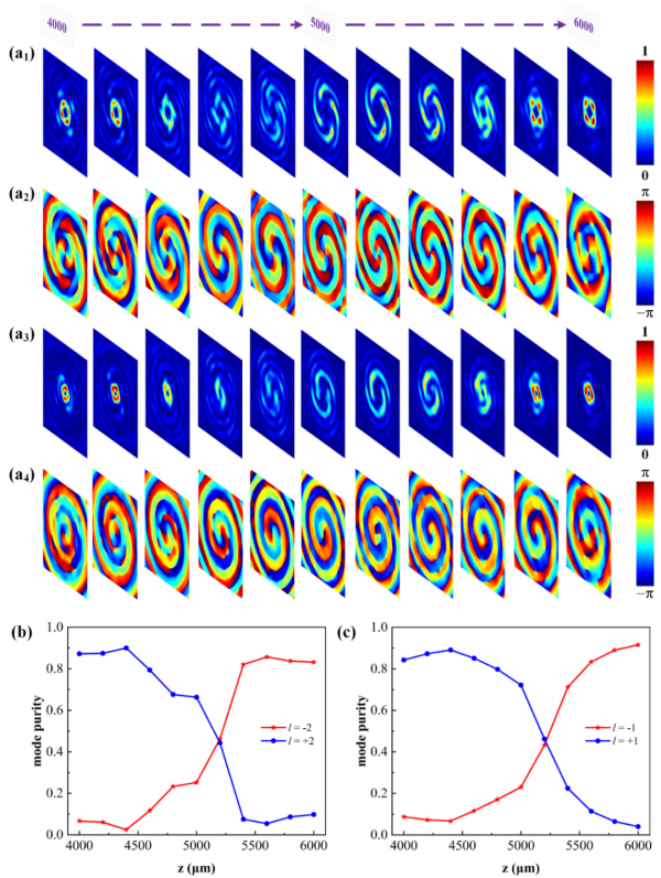 首先展示了該超表面器件產(chǎn)生縱向變化的渦旋光束的能力。在左旋圓偏振(LCP)波入射下,產(chǎn)生的渦旋光束的拓撲荷隨著傳播距離的增大從l = +2演化到 l = -2(如圖2a1和a2所示);在右旋圓偏振(RCP)波入射下,產(chǎn)生的渦旋光束的拓撲荷隨著傳播距離從l = +1演化到l  = -1(如圖2a3和a4所示)。計算的模式純度隨傳播距離的演化同樣證實了這一現(xiàn)象(如圖2b所示)。