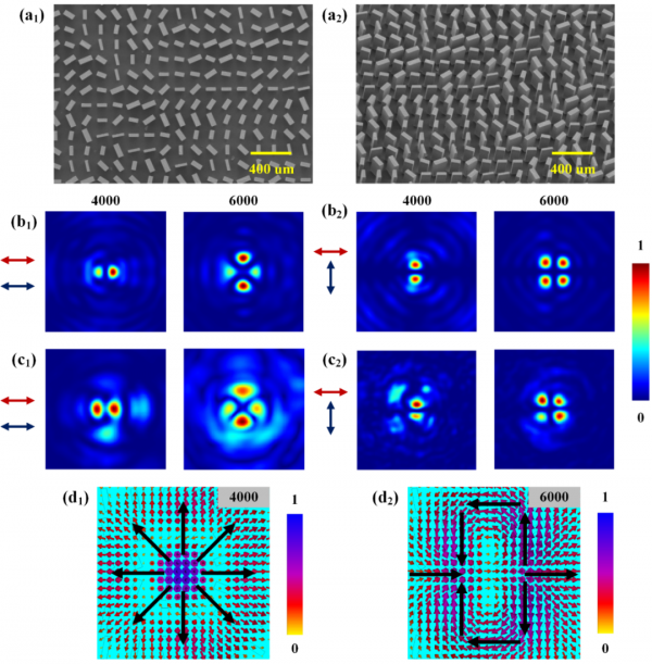 通過將產(chǎn)生多個渦旋態(tài)的相位賦予超表面,并操縱左右旋圓偏振間的相位差,設計了一種能夠產(chǎn)生的矢量渦旋態(tài)從一階徑向偏振往二階徑向偏振演化的超表面(如圖3)??梢酝ㄟ^觀察不同入射和出射偏振下的光強分布和仿真的偏振分布識別出相應場的偏振態(tài)。