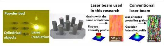 △從左到右:激光束照射在粉末床上,產(chǎn)生的圓柱形單晶物體。(右)可以應(yīng)用平頂激光束形成以相同取向排列的晶體,而應(yīng)用傳統(tǒng)的高斯激光束會導(dǎo)致晶粒取向較小