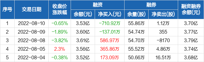 融資方面,當(dāng)日融資買入1214.67萬元,融資償還1925.58萬元,融資凈償還710.92萬元。融券方面,融券賣出5.44萬股,融券償還4.32萬股,融券余量55.86萬股,融券余額1698.18萬元。融資融券余額合計(jì)3.7億元。