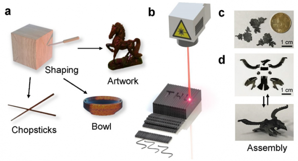 圖1 a傳統(tǒng)木雕生產(chǎn)的生活用品以及藝術品,b快速激光加工成型石墨烯氣凝膠過程,c激光雕刻石墨烯氣凝膠牡丹花樣品,d激光雕刻石墨烯氣凝膠可重復組裝的鷹樣品。