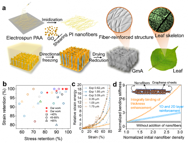 圖2 a GmA制備流程,b 經(jīng)過壓縮后的GmA的應力與應變保持率與文獻對比圖,c 理論模擬與實驗結果經(jīng)過歸一化后壓縮的相對應變能與應變關系圖,d 石墨烯骨架彎曲剛度與納米纖維初始密度的關系圖。