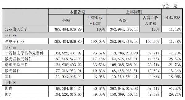 從下圖的營業(yè)收入構(gòu)成也可以看出,報(bào)告期內(nèi),福晶科技的主要收入來源為銷售精密學(xué)光元件(占比33.53%)、非線性光學(xué)晶體元器件(占比26.67%)、激光器件(占比19.62%)、激光晶體元器件(占比17.13%)等。除非線性光學(xué)晶體元器件的營收與去年同期下降7.73%外,均實(shí)現(xiàn)了幅度較大的增長。
