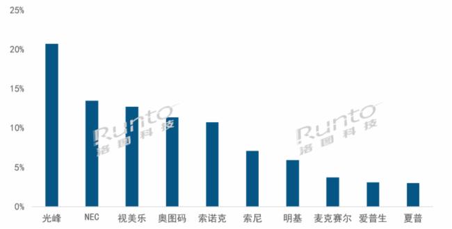 工程市場出貨量完成4.3萬臺,同比下降20.0%。在市場縮量的情況下,品牌排位開始發(fā)生變化。日系品牌快速衰退,愛普生盡管依然排名第一,但和索尼在工程市場的出貨量均發(fā)生了50%以上的同比下滑。同時,國內品牌光峰、迪恒、視美樂市場份額提升明顯。光峰以ALPD激光顯示技術優(yōu)勢,憑借差異化、細分化的產品設計,市場份額達到12%,增長4個百分點,排位第二。迪恒、視美樂分別側重泛工程市場和文旅項目開拓,同比增長70%左右,排名位居第三和第四。