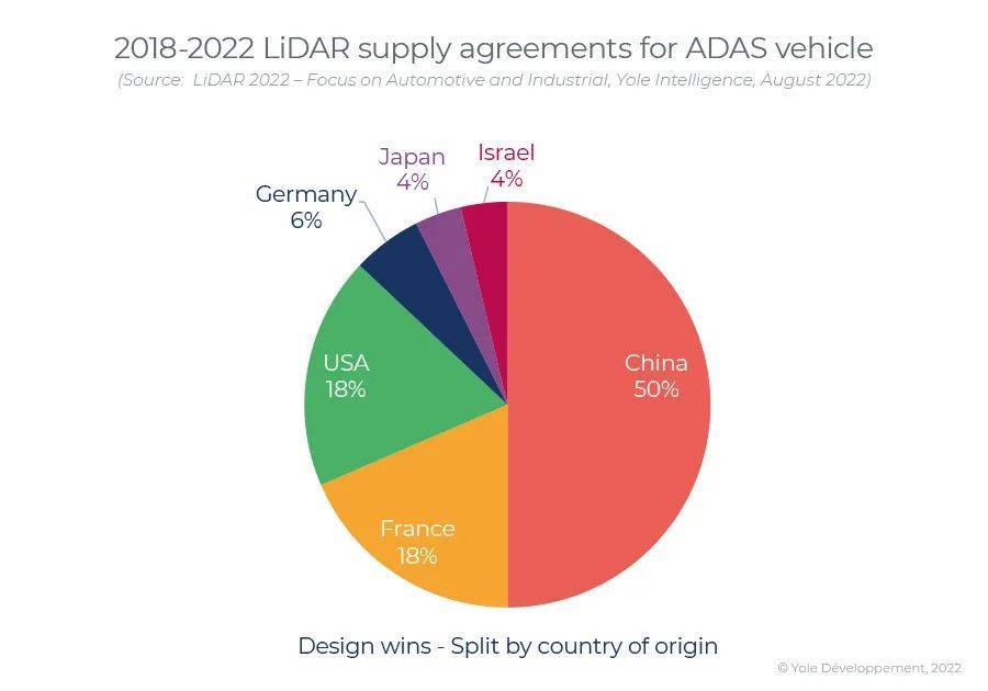 中國在全球汽車激光雷達(dá)市場中處于領(lǐng)先地位。來自中國的供應(yīng)商成為這一領(lǐng)域的佼佼者。2018年到2022年,中國的激光雷達(dá)供應(yīng)商占據(jù)前裝定點(diǎn)份額的50%,大幅領(lǐng)先于包括美國、法國、德國、日本、以色列等坐擁激光雷達(dá)企業(yè)的地區(qū)市場。