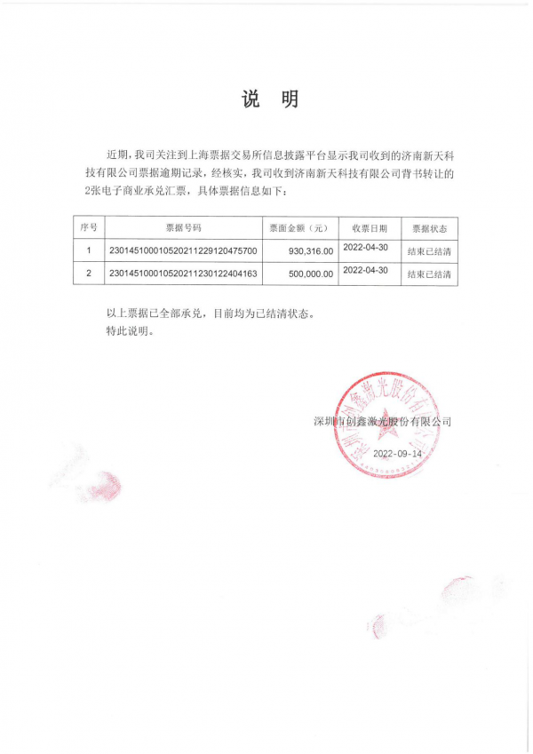 9月13日,網(wǎng)絡(luò)有傳關(guān)于“濟(jì)南新天科技有限公司逾期3142萬(wàn)余元被通報(bào)”的消息,該消息在未經(jīng)證實(shí)原因的情況下在網(wǎng)絡(luò)大肆傳播,對(duì)我司產(chǎn)生了不良影響。經(jīng)核實(shí),我司開(kāi)出的9張電子商業(yè)承兌匯票,金額合計(jì)31,421,714.00元,票據(jù)已結(jié)清,電子商業(yè)承兌匯票不存在信用風(fēng)險(xiǎn)。鏈接如下: