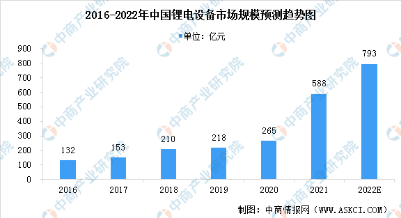 在電動(dòng)汽車產(chǎn)量高速增長(zhǎng)的帶動(dòng)下,我國(guó)鋰電池產(chǎn)業(yè)保持快速增長(zhǎng)態(tài)勢(shì),鋰電設(shè)備需求旺盛。高工鋰電數(shù)據(jù)顯示,2021年中國(guó)鋰電設(shè)備市場(chǎng)規(guī)模為588億元,2016年至2021年市場(chǎng)規(guī)模年均復(fù)合增長(zhǎng)率為35%,預(yù)計(jì)2022年中國(guó)鋰電設(shè)備市場(chǎng)規(guī)模將超過(guò)700億元。