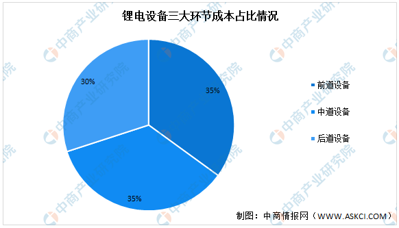 鋰電池生產(chǎn)工藝可以分為極片制造(前道設(shè)備)、電芯組裝(中道設(shè)備)、電芯激活檢測(cè)和電池封裝等(后道設(shè)備)三個(gè)階段,從鋰電池產(chǎn)線設(shè)備價(jià)值量看,鋰電池前道、中道、后道設(shè)備成本占比分別約為35%、35%、30%。