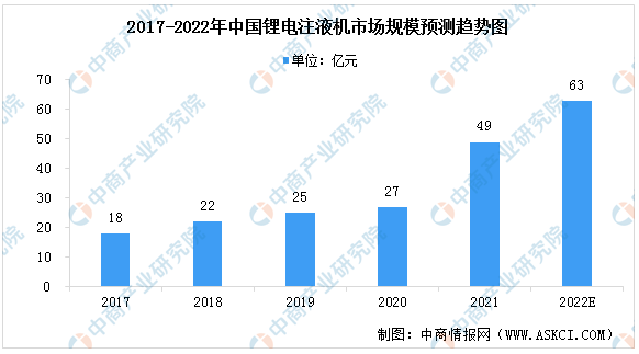注液機(jī)主要用于鋰電池注液工序,屬鋰電池制造中段工序的核心設(shè)備。注液機(jī)性能要求包括注液精度、注液速度、封裝可靠性、注液清潔度、設(shè)備尺寸、真空度等。GGII數(shù)據(jù)顯示,2021年國(guó)內(nèi)注液設(shè)備的市場(chǎng)規(guī)模為49億元,同比增長(zhǎng)81.84%,預(yù)計(jì)2022年國(guó)內(nèi)注液設(shè)備的市場(chǎng)規(guī)模將達(dá)到63億元。