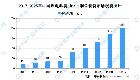 鋰電池模組PACK制造處于鋰電池制造的后一環(huán)節(jié),是電池廠與整車廠聯(lián)系最為緊密的環(huán)節(jié)。近幾年模組PACK自動(dòng)化升級(jí)需求明顯,對(duì)設(shè)備生產(chǎn)效率要求增加,推動(dòng)設(shè)備迭代技術(shù)加快。由于鋰電池產(chǎn)能擴(kuò)張以及此環(huán)節(jié)自動(dòng)化程度提升,鋰電池模組PACK產(chǎn)值快速增長(zhǎng)。2021年,鋰電池模組PACK設(shè)備市場(chǎng)規(guī)模達(dá)到80億元,預(yù)計(jì)2022年中國(guó)鋰電池模組PACK設(shè)備將達(dá)到100億元。