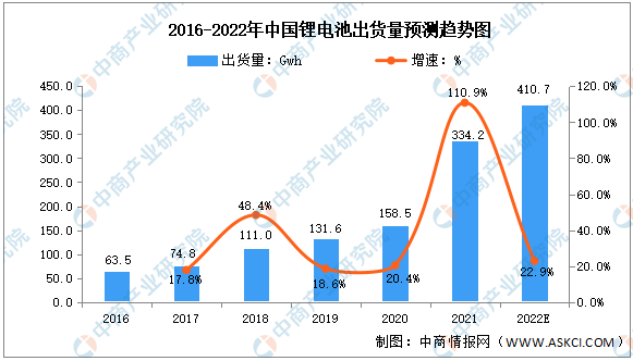 隨著我國(guó)新能源汽車的產(chǎn)銷量不斷提高,儲(chǔ)能領(lǐng)域?qū)崿F(xiàn)國(guó)內(nèi)外市場(chǎng)同步增長(zhǎng),同時(shí)鋰電池逐步替代鉛酸電池、鎳氫電池,在電動(dòng)兩輪車及電動(dòng)工具中得到廣泛應(yīng)用,鋰電池出貨量顯著增長(zhǎng)。數(shù)據(jù)顯示,2021年我國(guó)鋰電池出貨量達(dá)334.2Gwh,同比增長(zhǎng)110.9%。2016-2021年,我國(guó)鋰電池出貨量復(fù)合年均增長(zhǎng)率達(dá)39.4%,預(yù)計(jì)2022年我國(guó)鋰電池出貨量可增長(zhǎng)至410.7Gwh。