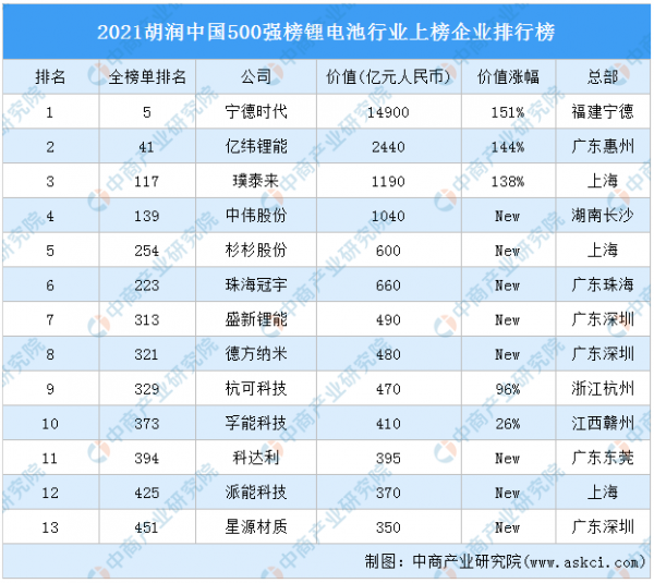 胡潤(rùn)研究院重磅發(fā)布了《2021胡潤(rùn)中國(guó)500強(qiáng)》榜單顯示鋰電池行業(yè)13家公司上榜,價(jià)值總計(jì)23795億元。其中4家公司價(jià)值超千億。寧德時(shí)代價(jià)值最高達(dá)14900億元。億緯鋰能、璞泰來(lái)排名第二和第三,價(jià)值分別為2440億元、1190億元。中偉股份、杉杉股份、珠海冠宇、盛新鋰能、德方納米、杭可科技、孚能科技進(jìn)入前十,依次排名第4-10名。