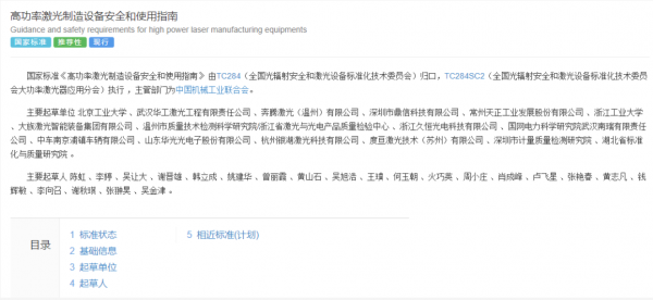 2019 年12月31日,國家標(biāo)準(zhǔn)化管理委員會(huì)下達(dá)2019年第四批推薦性國家標(biāo)準(zhǔn)計(jì)劃《高功率激光制造設(shè)備安全和使用指南,計(jì)劃編號為 20194046-T-604。推動(dòng)標(biāo)準(zhǔn)實(shí)施,讓標(biāo)準(zhǔn)成為對質(zhì)量的“硬約束”是國家“十三五”發(fā)展建設(shè)規(guī)劃的重要任務(wù)之一。本任務(wù)是SAC/TC284“十三五”規(guī)劃立項(xiàng)的標(biāo)準(zhǔn)之一,全國光輻射安全和激光設(shè)備標(biāo)準(zhǔn)化技術(shù)委員會(huì)(SAC/TC284)響應(yīng)國家“十三五”發(fā)展建設(shè)規(guī)劃,制定了《高功率激光制造設(shè)備安全和使用指南》。