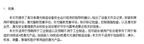 本文件適用于預(yù)期用于工業(yè)制造以及預(yù)期不用于工業(yè)制造,但可能會(huì)被用戶在合理?xiàng)l件下用于制造的3B類或4類激光產(chǎn)品,包括嵌入3B類或4類激光光源的制造設(shè)備。本文件不適用于包括娛樂、演示、校準(zhǔn)、測量、教育和醫(yī)療等用途的激光產(chǎn)品。