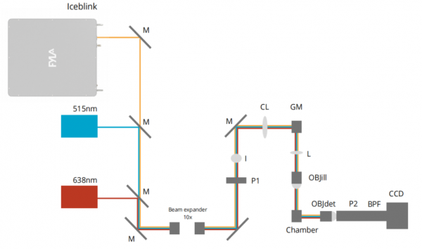 這種設(shè)置包括一個(gè)超連續(xù)激光光源(Iceblink),兩個(gè)用于引導(dǎo)光線的鏡子,一個(gè)(或兩個(gè),取決于探測(cè)器)中性密度濾光片,用于降低光線強(qiáng)度,避免飽和相機(jī)和偏振器。
