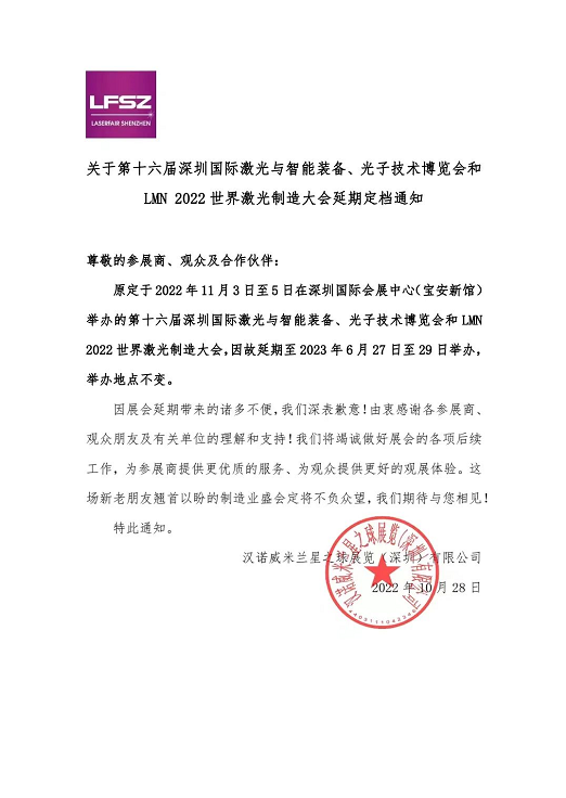 定檔通知 | 關(guān)于第十六屆深圳國際激光與智能裝備、光子技術(shù)博覽會和LMN 2022 世界激光制造大會延期定檔通知