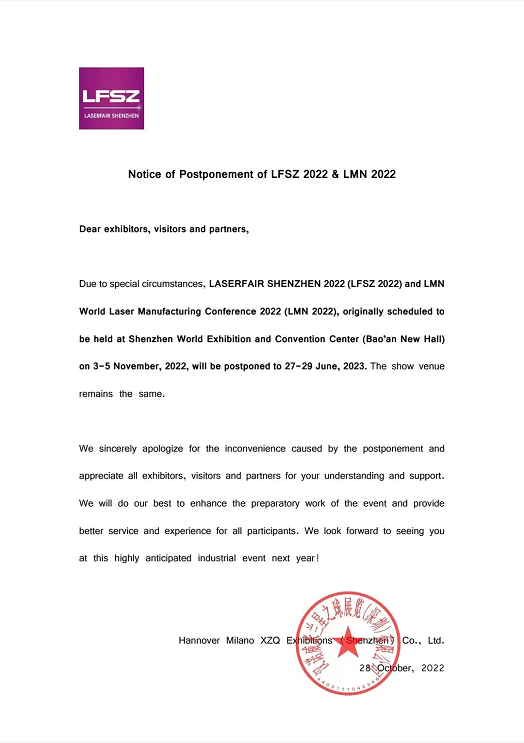 Due to special circumstances, LASERFAIR SHENZHEN 2022 (LFSZ 2022) and LMN World Laser Manufacturing Conference 2022 (LMN 2022), originally scheduled to be held at Shenzhen World Exhibition and Convention Center (Bao’an New Hall) on 3-5 November, 2022, will be postponed to 27-29 June, 2023. The show venue remains the same.