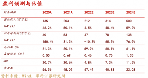 ?投資建議。我們預(yù)計(jì)2022-2024年?duì)I業(yè)收入分別為2.12/3.14/5.00億元;實(shí)現(xiàn)歸母凈利潤(rùn)分別為0.47/0.78/1.38億元,對(duì)應(yīng)EPS分別為0.46/0.76/1.35元,對(duì)應(yīng)2022年10月11日31.11元/股收盤(pán)價(jià),22-24年P(guān)E分別為67/41/23倍??紤]到公司業(yè)務(wù)具備較大發(fā)展空間及盈利能力預(yù)計(jì)顯著改善,首次覆蓋,我們給予“買(mǎi)入”評(píng)級(jí)。
