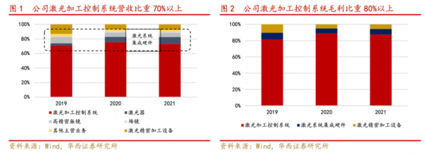 激光加工控制系統(tǒng)營(yíng)收占比較高,貢獻(xiàn)主要業(yè)績(jī)。從營(yíng)收角度來(lái)看,2019-2021年,公司激光加工控制系統(tǒng)占公司總營(yíng)收的比例分別為70.22%、76.14%和72.97%;激光系統(tǒng)集成硬件分別為16.94%、17.33%和19.68%;激光精密加工設(shè)備分別為12.84%、6.53%和7.36%。從毛利角度來(lái)看,2019-2021年公司激光加工控制系統(tǒng)毛利占比維持在80%以上,是公司主要的利潤(rùn)來(lái)源。