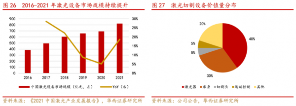 我國(guó)激光加工行業(yè)實(shí)現(xiàn)快速發(fā)展,激光控制系統(tǒng)市場(chǎng)規(guī)模約41億元。據(jù)統(tǒng)計(jì),數(shù)據(jù)顯示,我國(guó)激光設(shè)備產(chǎn)量從2016年的5.58萬(wàn)臺(tái)迅速增長(zhǎng)至2021年的20.19萬(wàn)臺(tái),期間年均復(fù)合增速為29.33%。根據(jù)《中國(guó)激光產(chǎn)業(yè)發(fā)展報(bào)告》數(shù)據(jù),2021年中國(guó)激光加工設(shè)備市場(chǎng)規(guī)模約821億元。假設(shè)激光控制系統(tǒng)占比約5%(以切割設(shè)備相關(guān)數(shù)據(jù)進(jìn)行參考),預(yù)計(jì)2021年激光控制系統(tǒng)市場(chǎng)規(guī)模約41億元。