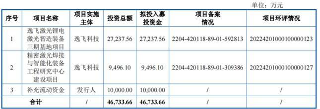 本次募資擬投入逸飛激光鋰電激光智造裝備三期基地項(xiàng)目、精密激光焊接與智能化裝備工程研究中心建設(shè)項(xiàng)目及補(bǔ)充流動(dòng)資金。