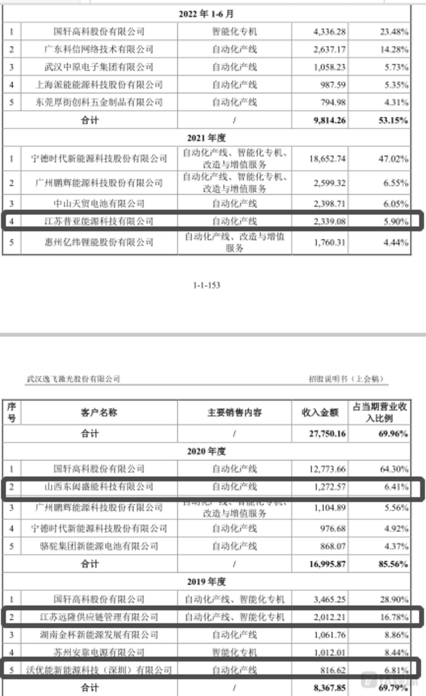招股說(shuō)明書(shū)顯示,2019年和2020年,逸飛激光向國(guó)軒高科產(chǎn)生的銷(xiāo)售收入分別為3465.25萬(wàn)元、12773.66萬(wàn)元,國(guó)軒高科也霸占著逸飛激光的第一大客戶(hù)頭銜。然而,2021年,國(guó)軒高科不僅不是逸飛激光的第一大客戶(hù)更是從前五大客戶(hù)名單中消失,到了2022年上半年,國(guó)軒高科又成為了逸飛激光的第一大客戶(hù)。