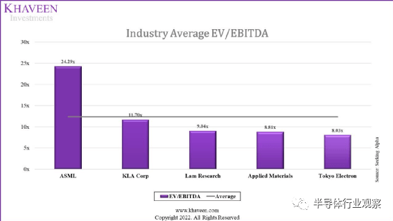 這家光刻機龍頭似乎總有一股魔力,哪怕在10月份,整體半導體設備廠商的股價都步入低谷之際,ASML依舊讓投資機構給出了超凡的估值。Khaveen Investments在10月11日的報告中,給出了ASML 24.29x的企業(yè)估值數(shù)據,而他們認為半導體設備行業(yè)平均EV / EBITDA (EV/EBITDA 又稱企業(yè)價值倍數(shù),是一種被廣泛使用的公司估值指標)僅為12.37 x,是 ASML的一半,其余KLA、Lam Research、應用材料、Tokyo Electron (TEL)等幾家設備巨頭的估值甚至皆未達到均值。