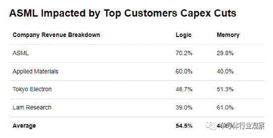 Khaveen Investments數(shù)據顯示,存儲業(yè)務是Lam Research最大的業(yè)務,61%的營收來自于此;TEL的存儲收入占了51.3%,TEL日前下修財測的原因中就包括了內存廠商變更或延后設備投資;AMAT的存儲收入則占了40%;相比下ASML 29.8%的存儲收入占比遠低于其他幾家設備廠商,因此其受到的資本縮減影響也相對較少。