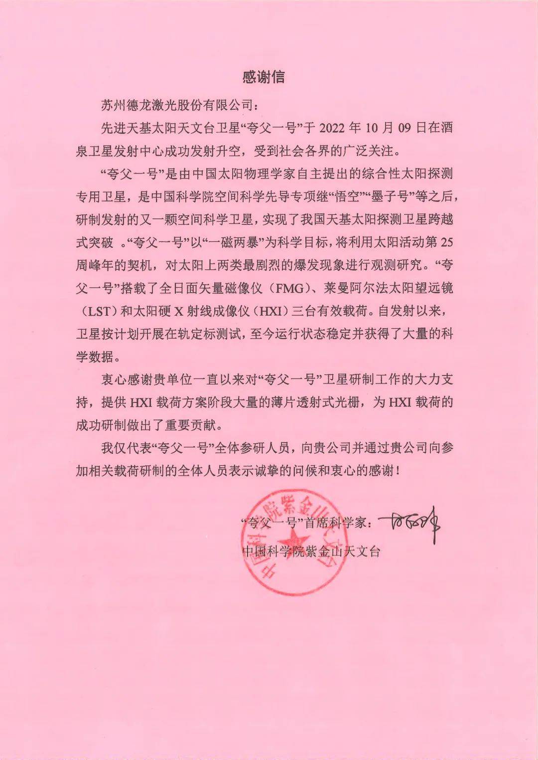 近日,德龍激光收到中國(guó)科學(xué)院紫金山天文臺(tái)發(fā)來(lái)的感謝信,感謝德龍激光一直以來(lái)對(duì)“夸父一號(hào)”衛(wèi)星研制工作的大力支持,提供HXI載荷方案階段大量的薄片透射式光柵,為HXI載荷的成功研制做出了重要貢獻(xiàn)。