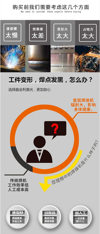很多不銹鋼產(chǎn)品生產(chǎn)加工都是用的是氬弧焊機(jī)和其他的普通焊機(jī),雖然這些可以滿足生產(chǎn)的需要,但是會(huì)在焊接的過程中留下焊接的缺陷如:咬邊、未焊透、密集氣孔和裂紋不僅降低接頭的牢固性,而且還會(huì)成為縫隙腐蝕的腐蝕源。在焊接的工藝上不僅要焊工的技術(shù)有一定的水平,而且對(duì)焊接的技巧和焊劑的成本要求過大,會(huì)提高生產(chǎn)所需的成本。而且焊后還要進(jìn)行加工的工作步驟,時(shí)間效率非常緩慢。正因?yàn)橛辛诉@些缺陷的存在,激光焊接機(jī)孕育而生!