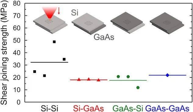 對(duì)比圖4中得到的剪切連接強(qiáng)度值,可以注意到這些值都在同一個(gè)數(shù)量級(jí),其中Si-Si表現(xiàn)出最強(qiáng)的粘結(jié)。不同的材料焊接配置,無論是Si或GaAs在頂部,得到的值相似,都小于Si - Si得到的值。盡管對(duì)GaAs-GaAs焊接情況進(jìn)行了一次測量,但結(jié)果表明Si-Si樣品的性能水平(測量分布的底部),因此與類似半導(dǎo)體焊接所獲得的優(yōu)異性能一致。與此同時(shí),有趣的是,與GaAs-Si相比,Si-GaAs結(jié)構(gòu)中測量的統(tǒng)計(jì)色散有所減少。這表明GaAs對(duì)實(shí)驗(yàn)波動(dòng)具有更好的魯棒性,這也可以歸因于GaAs的修飾閾值明顯低于Si。考慮到這一點(diǎn),我們假設(shè)Si - GaAs結(jié)構(gòu)必須容忍更多的光學(xué)接觸缺陷,即使在兩個(gè)分離良好的表面(R = 30%)的預(yù)期界面透射率約為50%,在Si和GaAs低樣品中,材料熔化也很容易同時(shí)達(dá)到。