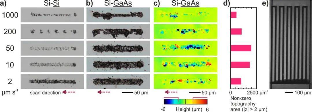 在圖3b中,展示了底部GaAs上產(chǎn)生的線的代表性圖像選擇。較低的修飾閾值使GaAs的相互作用更強(qiáng),從而產(chǎn)生更寬(≈30μm)和更明顯的線條。然而,與之前不同的是,對(duì)共焦圖像的分析(圖3c)揭示了最佳掃描速度,對(duì)應(yīng)于50 μm s-1,而不是最慢的掃描速度。為了說明這方面的詳細(xì)分析,我們?cè)趫D3d中為圖3c的每張圖像展示了地形中海拔或凹陷超過2 μm的區(qū)域(|z|>2 μm)。將這一任意判據(jù)作為材料混合概率的評(píng)價(jià)標(biāo)準(zhǔn),得出最佳掃描速度為50 μm s-1。與Si相比,這種增加的速度允許對(duì)幾個(gè)樣品進(jìn)行更快的光柵掃描輻照(如圖3e所示),從而在這種不同的半導(dǎo)體配置中測量到18±1 MPa的剪切連接強(qiáng)度。與Si-Si相比的差異可以合理地歸因于與表現(xiàn)出不同熱機(jī)械性能的材料焊接相關(guān)的通常挑戰(zhàn)。然而,它是適合的而且測量的強(qiáng)度有趣地顯示了這種技術(shù)的潛力,即使用貫穿Si傳輸配置將Si與其他半導(dǎo)體焊接。