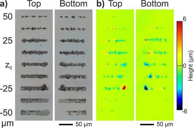 圖2:a)相對(duì)于參考位置Z0在不同焦距下界面周圍產(chǎn)生的線的頂部和底部晶片表面光學(xué)顯微鏡圖像。b)相應(yīng)的共聚焦顯微圖像顯示表面形貌。頂部和底部線的輪廓和地形都相互匹配,表明晶圓之間有材料轉(zhuǎn)移。注意圖1a中所示的頂部和底部圖像之間處理區(qū)域的鏡像對(duì)應(yīng)關(guān)系。