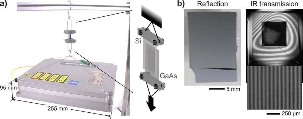 圖5:a)實(shí)驗(yàn)中使用的激光源圖像(≈3 kg)掛在焊接在GaAs上的Si晶片上。圖示如圖所示。b)從紅外透射圖像中,我們觀察到總處理面積為3.5 ×7.0 mm2,從中我們估計(jì)對(duì)剪切力的阻力高達(dá)400 n。紅外圖像上可見的干涉條紋歸因于材料界面處的法布里-珀羅腔,從而揭示了接觸不均勻性。
