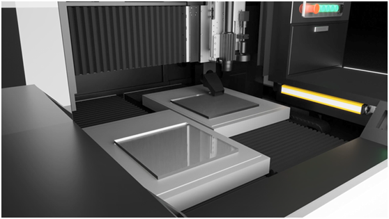雙Y平臺工作原理:當平臺A進入加工區(qū)域后,開始切割,同時平臺B移動到外側(cè),進行放料;平臺A加工完后,移出工作區(qū),平臺B進入加工區(qū)域,開始切割。
