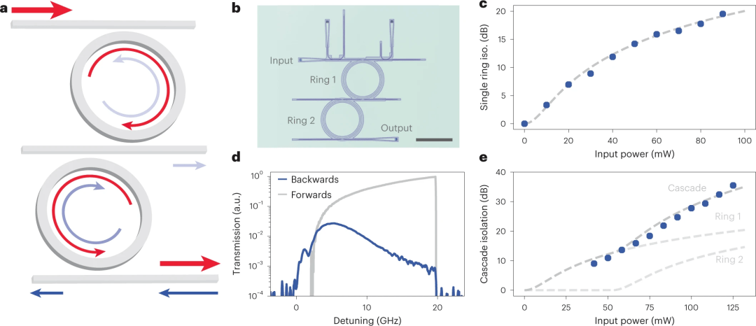 圖4:隔離級聯(lián)。a,級聯(lián)隔離環(huán)示意圖。b,制造的級聯(lián)隔離環(huán)的光學(xué)顯微照片。比例尺,200 μm。c,理論(虛線)和實驗(藍(lán)色數(shù)據(jù)點)功率相關(guān)的單環(huán)隔離。d、級聯(lián)隔離環(huán)與110mw泵正向和反向傳輸。e,理論(虛線)和實驗(藍(lán)色數(shù)據(jù)點)級聯(lián)環(huán)的功率依賴隔離。理論擬合是通過將單個環(huán)的隔離比乘以從第一個環(huán)紅移的第二個環(huán)來計算的。測量從40mw開始,因為需要這么多的泵浦功率來重疊兩個環(huán)共振。