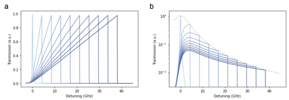 圖S3:隔離器模型。a.熱拉隔離環(huán)正向傳動。藍(lán)色越深,輸入功率越高。b.熱拉隔離環(huán)反向傳動。深藍(lán)色代表更高的泵功率。由于失諧隨輸入功率的增加而增加,我們期望看到在每個功率級別上具有最大失諧的洛倫茲傳輸,如虛線所示。