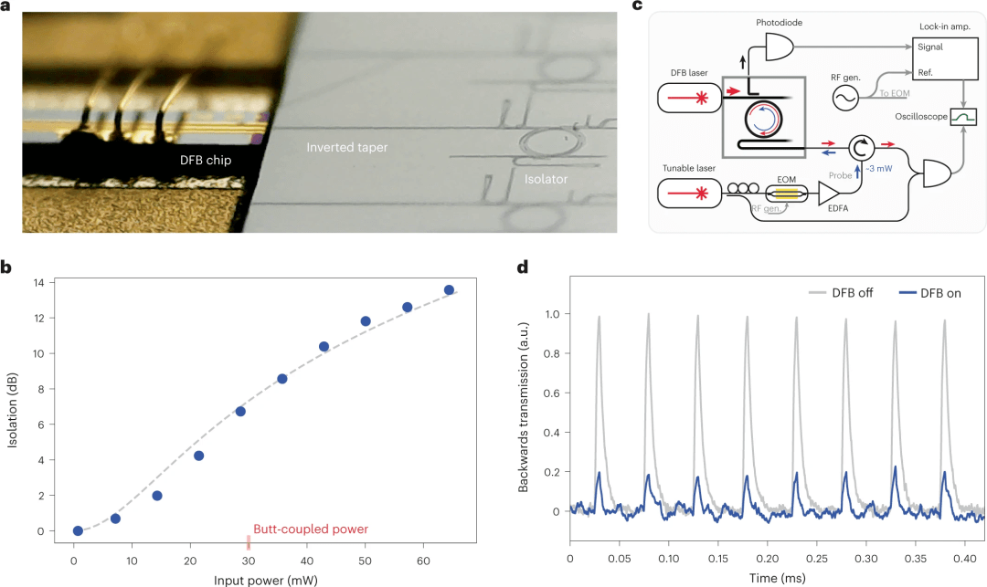 圖5:DFB混合積分。a, DFB激光器與隔離器混合集成的光學(xué)圖像。b,用放大DFB激光器測量的功率依賴隔離。藍(lán)色數(shù)據(jù)點表示測量結(jié)果,虛線表示理論擬合。c,混合集成dfb隔離器操作直接測量的實驗測量裝置示意圖。d,直接耦合DFB激光器開啟和關(guān)閉后向脈沖傳輸。
