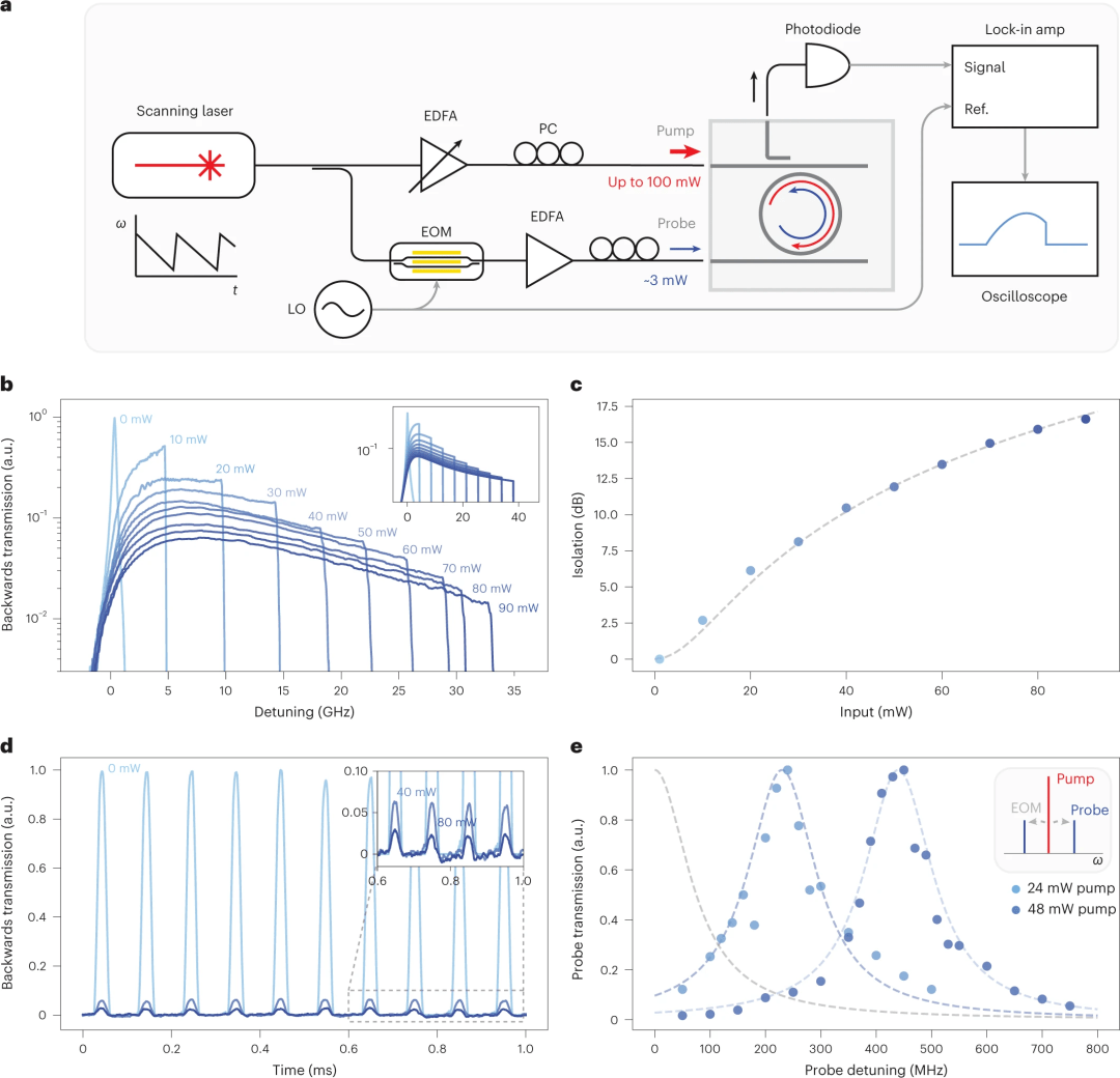 圖2:隔離測量。a,表征非線性光學(xué)隔離器的測量裝置示意圖。EDFA,摻鉺光纖放大器;EOM,電光調(diào)制器。PC,偏振控制器;LO, 90千赫電子振蕩器。b,依賴泵功率的向后傳輸測量。插圖:理論泵功率依賴關(guān)系。插圖中的線條顏色與主面板中的顏色相對應(yīng)。c,相應(yīng)的理論(虛線)和實驗(藍(lán)色數(shù)據(jù)點)器件隔離。數(shù)據(jù)點顏色對應(yīng)于b. d中使用的顏色,隨著泵功率的增加(0 mW, 40 mW, 80 mW)脈沖向后傳輸測量。插圖顯示了虛線框中繪圖部分的放大圖。e,反向傳輸?shù)睦碚?虛線)和實驗(藍(lán)色數(shù)據(jù)點)頻率依賴關(guān)系。在這里,探頭被EOM分割成兩個邊帶,這種邊帶分離用頻率合成器進(jìn)行掃頻。正如預(yù)期的那樣,向后頻率響應(yīng)與泵功率成比例地移位。