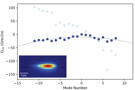 圖S2:隔離器分散。測量環(huán)形諧振腔模式的綜合色散。基本模式顯示在插圖中,圖中深藍(lán)色部分保持正常色散,允許高功率輸入泵沒有偽OPO。兩個高階模的色散用淺藍(lán)色表示。該環(huán)的FSR為240.5 GHz。