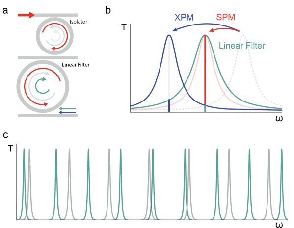圖S1:a.線性濾波器寬帶隔離原理圖。紅色為泵,綠色為泵的反向傳播信號簡并,藍(lán)色為隔離器的反向諧振的反向傳播信號。b.系統(tǒng)頻率響應(yīng)。線性濾波器傳輸泵和阻擋光的傳輸,可以通過隔離器在XPM共振。c.通過設(shè)計線性濾波器,使其具有不是隔離器FSR倍數(shù)的FSR(自由光譜范圍),可以實現(xiàn)超寬帶隔離。