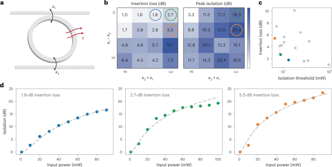 圖3:性能優(yōu)化。a,隔離器環(huán)示意圖,說明關(guān)鍵參數(shù):κ1, κ2和γ -輸入耦合率,輸出耦合率和固有損耗率。b,熱圖顯示不同偶聯(lián)率下的插入損失和峰值隔離。色條限制由每個圖的最小值和最大值設(shè)定(白色:1.0 db插入損耗,3.3 db峰值隔離;深藍(lán)色:10.1 db插入損耗,23.4 db峰值隔離)。表現(xiàn)良好的參數(shù)用藍(lán)色、綠色和橙色圓圈突出顯示。c, b的隔離和插入損失的相關(guān)性d,三個突出顯示環(huán)的泵功率依賴隔離。