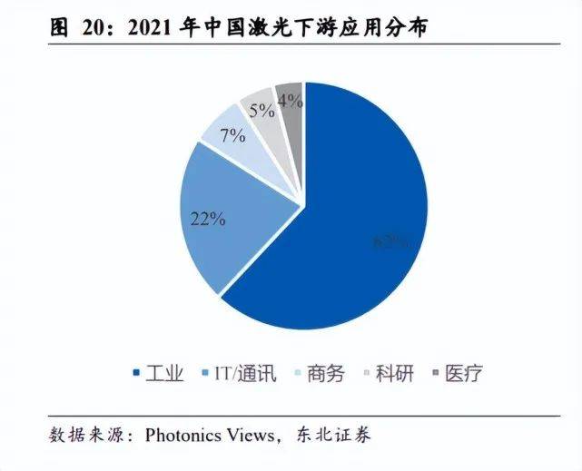 從終端應(yīng)用規(guī)模來(lái)看,占比較多的同樣為激光打標(biāo)設(shè)備、激光切割設(shè)備和激光焊接 設(shè)備。早年間受限于激光器功率,激光打標(biāo)設(shè)備占據(jù)了主要市場(chǎng)份額,但隨著激光 技術(shù)的發(fā)展,激光打標(biāo)設(shè)備的占比從 2002 年的 49%萎縮到了 2021 年的 13%,激 光切割設(shè)備的占比從 2002 年的 23%增長(zhǎng)到了 2021 年的 40%,成為激光加工設(shè)備 最大的終端應(yīng)用領(lǐng)域。