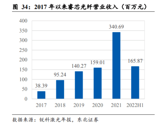 2018 年后,光纖國(guó)產(chǎn)化進(jìn)程加速。銳科激光于 2017 年收購(gòu)武漢睿芯開始自主進(jìn)行 工業(yè)激光器用光纖的研制與生產(chǎn),睿芯 2017 年開始進(jìn)行量產(chǎn)并向銳科供貨,根據(jù)銳 科激光歷年年報(bào)中披露的數(shù)據(jù),睿芯營(yíng)收逐年增長(zhǎng),且 2021 年以來(lái)產(chǎn)能擴(kuò)張明顯。銳科激光2022年4月在深交所平臺(tái)答投資者問(wèn)時(shí)表示公司生產(chǎn)所用的特種光纖70% 來(lái)自于睿芯的自供。此外創(chuàng)鑫激光 2018 年底起開始導(dǎo)入國(guó)產(chǎn)光纖,并且與長(zhǎng)飛光 纖建立了戰(zhàn)略合作關(guān)系,2019 上半年長(zhǎng)飛光纖已成為公司第一大供應(yīng)商。據(jù)《2022 中國(guó)激光產(chǎn)業(yè)發(fā)展報(bào)告》,2022 年我國(guó)激光器用特種光纖市場(chǎng)規(guī)模將達(dá)到 14.9 億, 2021 年武漢睿芯和長(zhǎng)飛光纖在我國(guó)激光器用特種光纖中的市占率分別為 26.8%和 14.2%。根據(jù)以上數(shù)據(jù),預(yù)計(jì) 2021 年我國(guó)激光器用特種光纖國(guó)產(chǎn)化率已在 50%以 上。